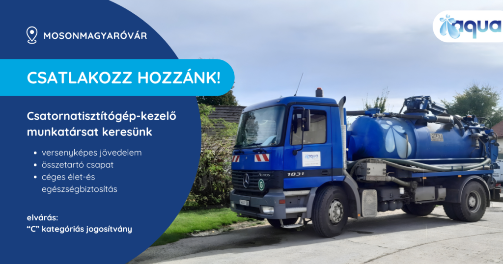 Az AQUA Kft. csapatába keressük leendő kollégánkat a szennyvízhálózat üzemeltetéséhez. A feladatok közé tartozik többek között a gépjármű vezetése és kezelése a hálózati meghibásodások, csőtörések és dugulások elhárítása során, valamint az általános üzemfenntartási munkák elvégzése.